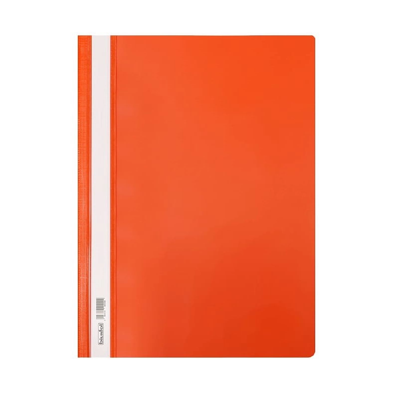 Skoroszyt bez oczek. Przednia okładka przezroczysta twarda, druga kolorowa. Wykonany z mocnego i sztywnego PVC. Wyposażony w papierowy, wysuwany pasek do opisu. Po przeciwnych stronach grzbietu znajdują się dwa wycięcia ułatwiające wysuwanie paska.