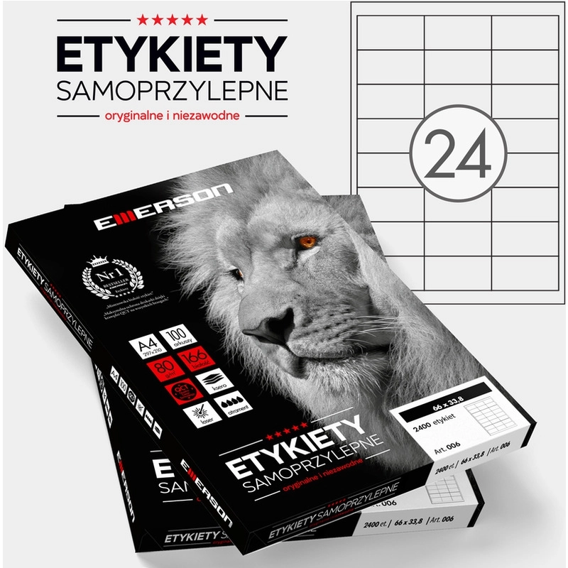 Etykiety Samoprzylepne Emerson wymiary 64 x 33,8 mm, 24 etykiety na arkuszu A4, 100 arkuszy w opakowaniu