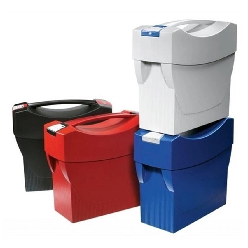 Zamykany wiekiem z opatentowanymi zamknięciami klipsowymi. Na wieku etykieta opisowa oraz uchwyt ułatwiający przenoszenie zamkniętego pojemnika. Praktyczne rączki umożliwiają wygodne przenoszenie pojemnika. Przy zdjętym wieku możliwość umieszczenia artykułów piszących przy rączkach.