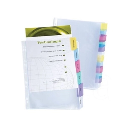 Koszulka z kolorowymi przekładkami w celu łatwej personalizacji. Idealnie pasuje do segregatorów. Poszerzony róg ułatwiający wkładanie dokumentów.