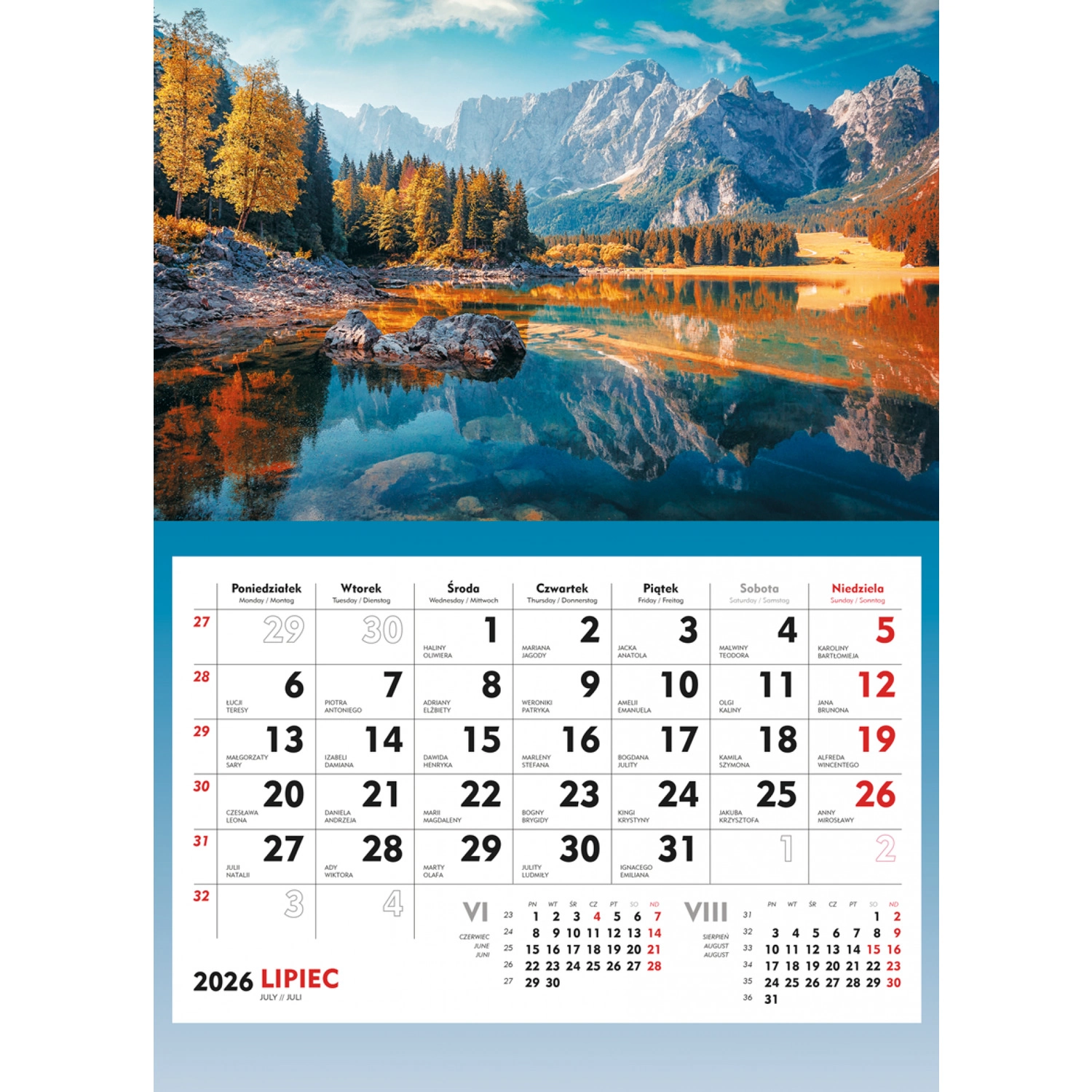 • główka pełnokolorowa, okienko przesuwane, nazwy miesięcy i tygodni w wersjach językowych, miejsce na nadruk reklamowy
