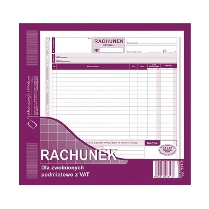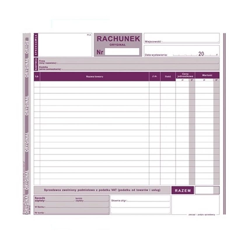 Rachunek Dla Zwolnionych Podmiotowo Z Vat 231-2 Rachunek dla zwolnionych podmiotowo z VAT (2/3 A4) I indeks: 231-2 I typ: jednostronny,samokopiujący