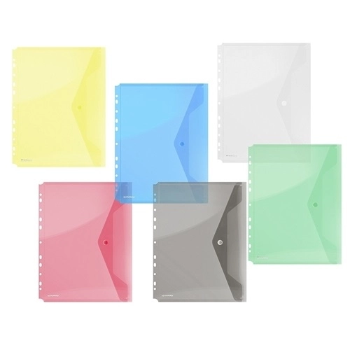 Teczka kopertowa Deli zamykana na zatrzask. Transparentna, wykonana z ekologicznego polipropylenu o grubości 200 μm. Europerforacja umożliwia wpięcie do każdego segregatora.
