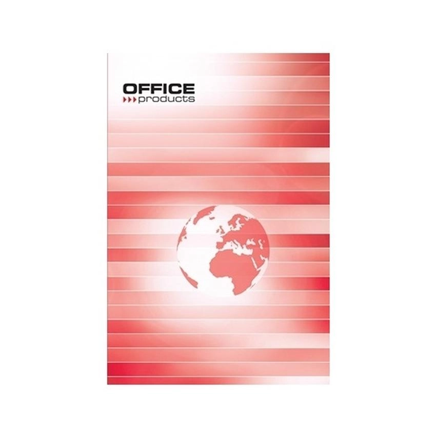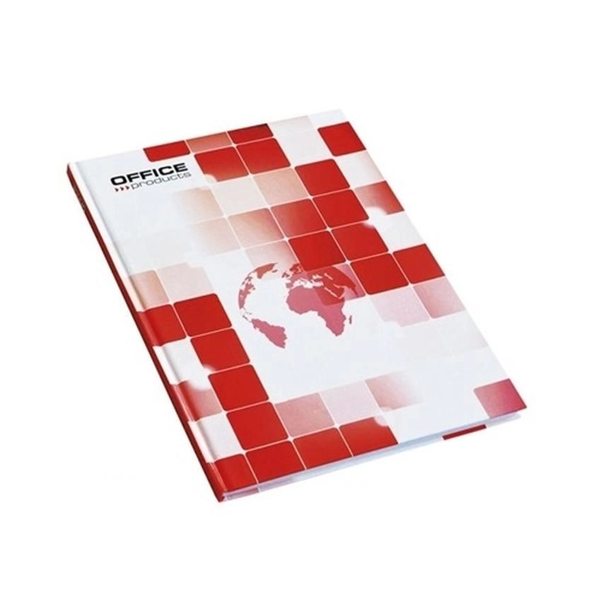 Brulion Office Products, wytrzymały - szyty i klejony. Laminowana okładka, wewnętrzne strony z linią marginesu w kolorze czerwonym.
