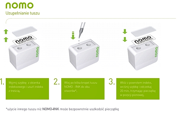Pieczątki NOMO nie wymagają wymiany poduszek. Zapas tuszu jest kilkakrotnie większy niż w tradycyjnym automacie, a gdy zajdzie potrzeba można go łatwo samemu uzupełnić. Pieczątki automatyczne NOMO, dzięki kompaktowej budowie i trwałemu zamknięciu, posłużą również z powodzeniem w podróży, jako pieczątki kieszonkowe.