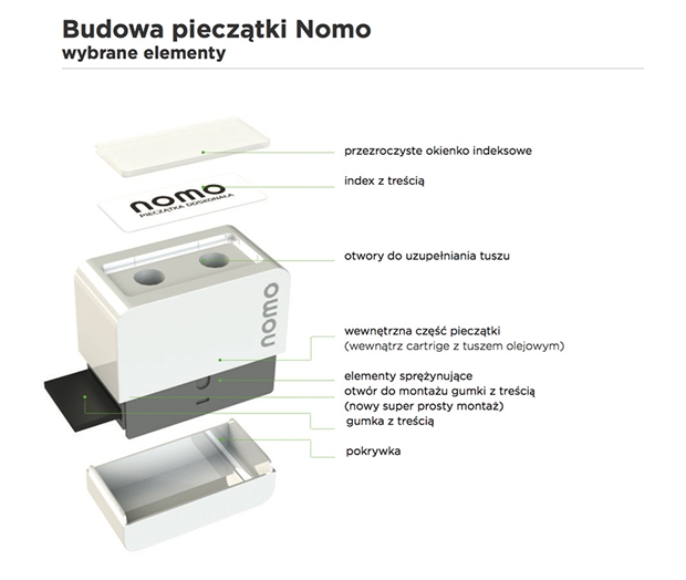 Pieczątki NOMO spełniają nowoczesne standardy projektowania urządzeń i przedmiotów biurowych. Modny design pieczątki NOMO nie ujmuje jej funkcjonalności. Precyzję wykonania oprawek zapewnia użycie form i urządzeń stosowanych również do produkcji nowoczesnych telefonów komórkowych.