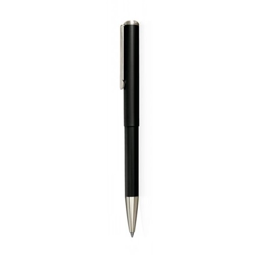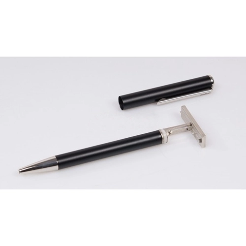 Długopis codziennego użytku wykonany z lakierowanego na czarno aluminium. Wbudowana pieczątka znajduje się w skuwce długopisu. W zestawie plastikowe etui.