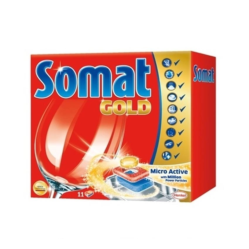 Tabletki Somat Gold zostały wzbogacone w enzymy rozpuszczające skrobię, dzięki czemu doskonale czyszczą wszelkie resztki po przypalonych ziemniakach czy makaronie. Dzięki unikalnej formule Somat Gold usuną całkowicie wszelki brud i tłuszcz z naczyń bez namaczania.