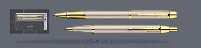 Długopis oraz pióro kulkowe Parker IM Standard to starannie wykonane instrumenty piśmienne. Prosty, klasyczny kształt. Korpus i skuwka ze szczotkowanego metalu pokrytego lakierem w subtelnym odcieniu szampana. Klips wyprofilowany na kształt strzały. Wykończenia pokryte 23-karatowym złotem. Uchwyt ze szczotkowanej stali. Pudełko składa się z etui duo wypełnionego wypraską obciągniętą tkaniną w kolorze grafitowym w komplecie z grafitową wsuwką zdobioną złotym logiem Parker. Całość zapakowana w tekturową obwolutę z przezroczystym okienkiem.