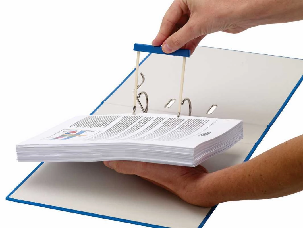 Plastikowe uchwyty do spinania oraz archiwizacji dokumentów z rączką ułatwiającą przenoszenie.