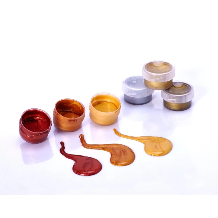 Farby dekoracyjne o połysku metalicznym są to farby wodne o kolorach do złudzenia przypominających połysk srebra, złota, mosiądzu, miedzi i brązu. Przeznaczone są do prac dekoracyjnych i ogólnoplastycznych, doskonale pokrywają powierzchnie na podłożach, które wchłaniają wodę, np. papier, masa papierowa, ceramika, karton, drewno. Kolory farb nie przenikają się, dlatego swobodnie można kłaść jeden kolor obok drugiego.