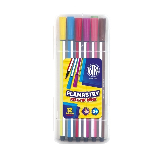 Wysokiej jakości flamastry produkowane są według najlepszych norm jakościowych. Dobra jakość tuszu oraz żywe kolory zapewnią dzieciom długie godziny zabawy. Flamastry ASTRA posiadają wentylowaną skuwkę.