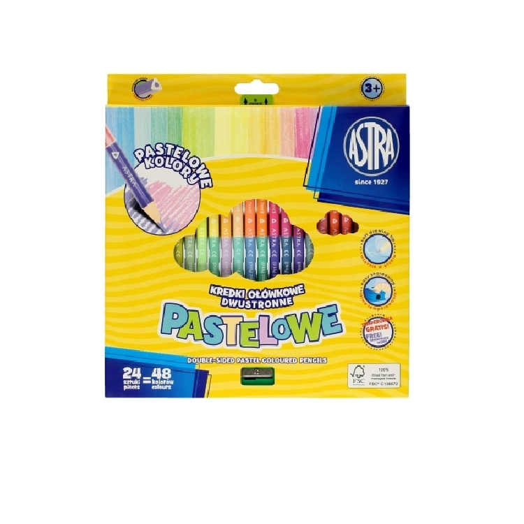 kredki dwustronne 24/48 kolorów ołówkowe pastelowe, z temperówką, ASTRA ( A.36737.4 )