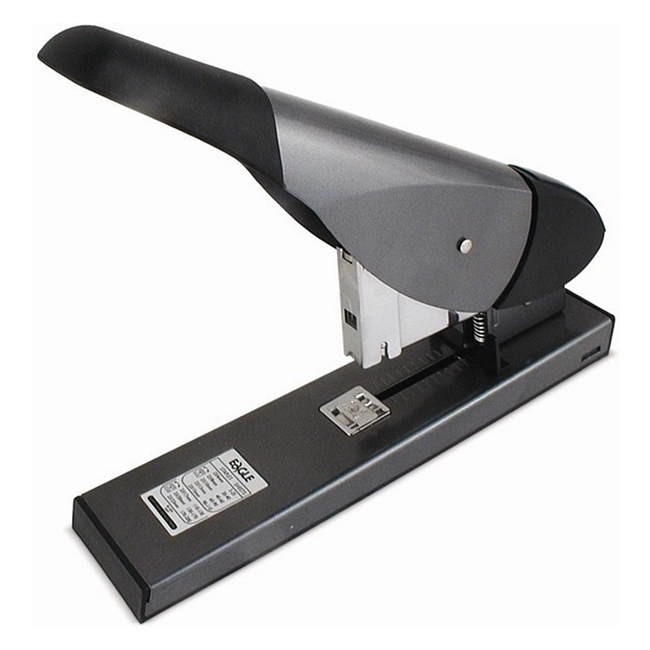 Zszywacz został wykonany z połączenia metalu i tworzywa sztucznego. Metalowa konstrukcja jest gwarancją trwałości, a z kolei gumowa rączka zapewni nam komfortową pracę.