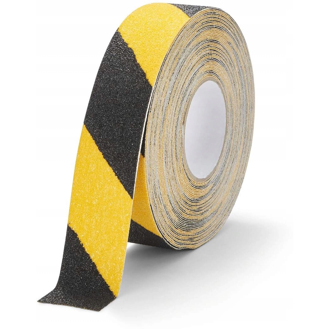 Antypoślizgowa taśma samoprzylepna o gruboziarnistej powierzchni do zwiekszenia bezpieczenstwa traktów komunikacyjnych na powierzchniach przemyslowych.